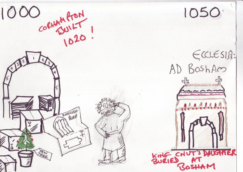 Corhampton (built in 1020 AD, 300 years after Bede’s Historia and replacing an earlier Church) survives from the Saxon era. Other