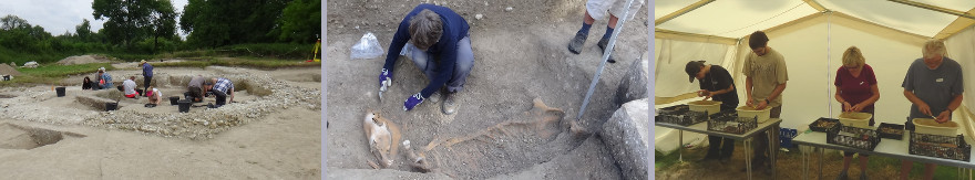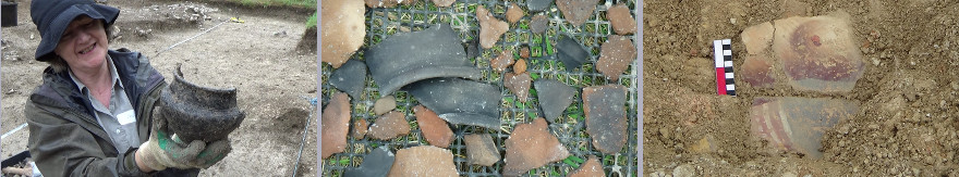 Our excavation in 2022 was at a new site in Meonstoke, and directed by Professor Tony King. Geophysics conducted in the area revealed an unusually large ditch, believed to be an Iron Age Hillfort. Within the ditch area a number of anomalies (changes) were discovered, consistent with Iron Age settlement. The aim of the excavation was to locate one of these features, believed to be an Iron Age roundhouse and provide dating evidence to support the results of the geophysics. However, our discoveries included a Bronze Age ring ditch and Saxon pits. One of the Saxon pits within the ring ditch cut through a human burial. We are now in the process of getting these bones radiocarbon dated.